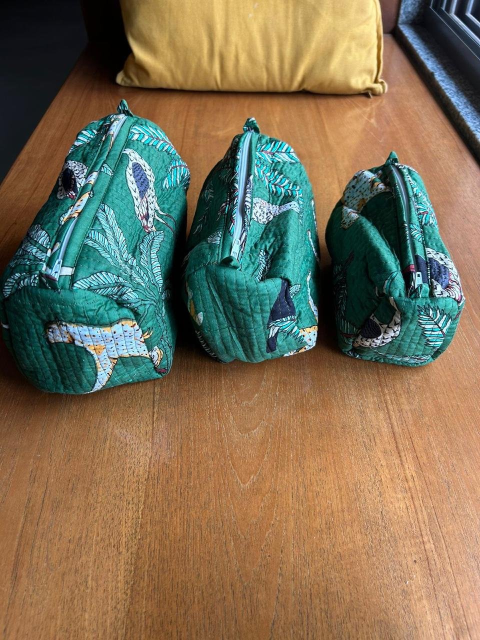 Jet Set Go!! Our travel and Cosmetic pouches are your passport to organized adventures. Compact yet spacious, they keep your essentials secure and accessible on-the-go. From toiletries to chargers to cosmetics these pouches are designed to streamline your travel experience. Crafted with quilted cotton fabric and sleek design, they effortlessly fit into your carry-on or suitcase. Say goodbye to rummaging and hello to hassle-free travel with our trusty travel pouches by your side.”